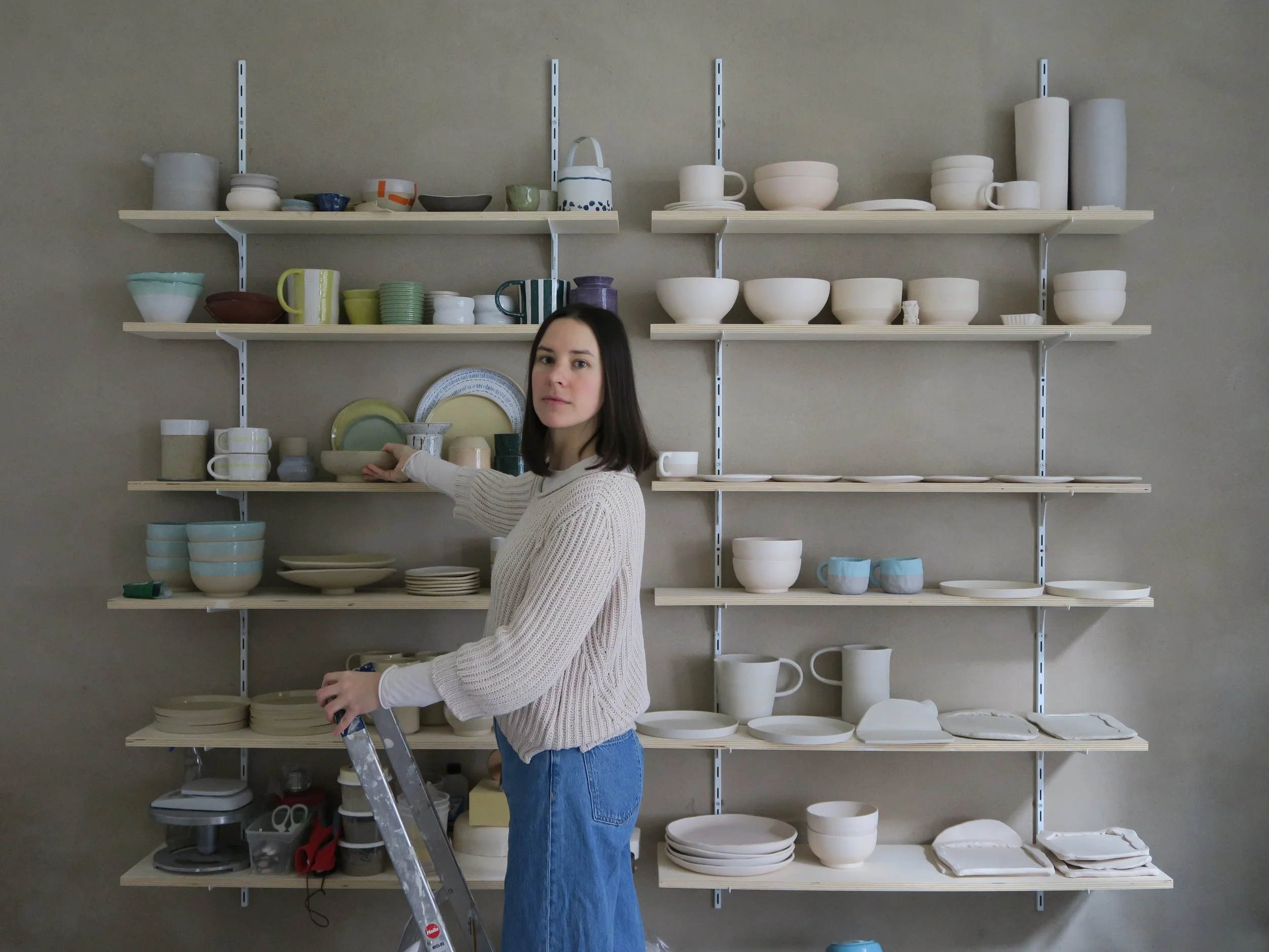 Most of her work is made on the potter’s wheel but some pieces are also hand built. From shaping the pieces to glazing and firing, it all takes place in her small studio.